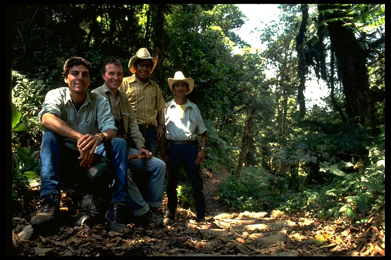 From left to right, Richard Margoluis, Tom Lovejoy, and two park guards pose for a photo in the Sierra de las Minas Biosphere Reserve, Guatemala